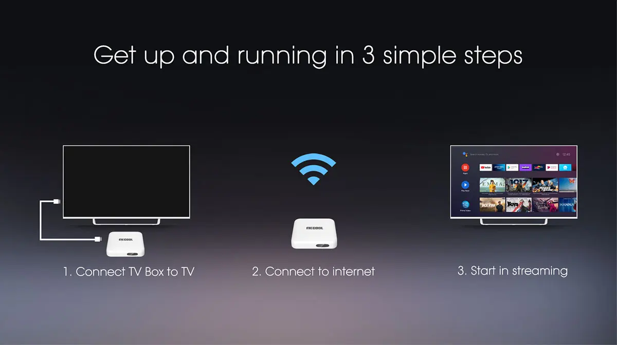 Only 3 steps and start watching movies. Connect HDMI cable and then connect to internet, open tv and start playing.